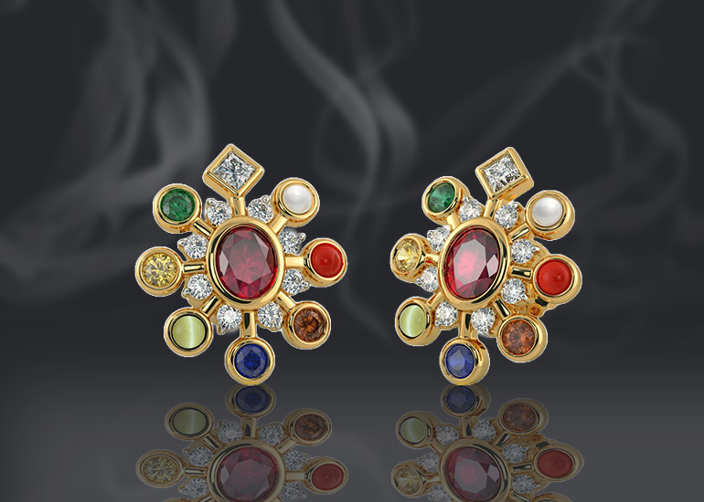Navaratna jewellery is now and trending; colourful, radiant and a true show of elegance this category of jewellery is finding its’ way into every girls’ jewellery box. The best part of Navaratna jewellery is that you don’t need to pick just one stone, you can have an array of nine gems to sparkle with it. Navaratna is a Sanskrit term which means “nine gems”. Each gem represents one celestial entity and the combination of these nine gems in one piece of jewellery is both auspicious and powerful according to various South-East Asian religions. The gems that constitute Navaratna jewellery are: Ruby, Pearl, Red Coral, Emerald, Yellow Sapphire, Diamond, Blue Sapphire, Hessonite and Cat’s Eye.